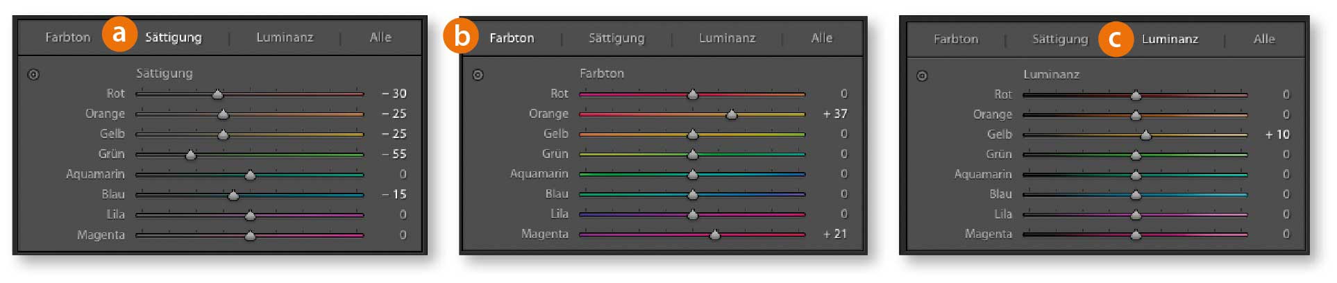 Alle Farben im Bild werden stark entsättigt – auch die „Hauptfarbe“ gelb (a). In den Reitern »Farbton« (b) und »Luminanz« (c) gleichen Sie ähnliche Farbtöne, wie zum Beispiel die der Tragetasche und der im Hintergrund zu sehenden Taxis an. Dadurch reduzieren Sie die Buntheit des Fotos und sorgen für wiederkehrende Farbelemente.