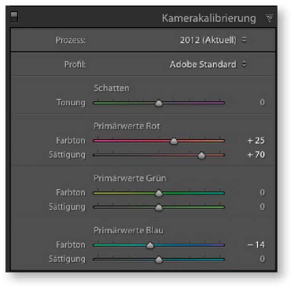 Für die finale Abstimmung der Farben kam hier der Reiter »Kamerakalibrierung« zum Einsatz. Die »Primärwerte rot« werden im Farbton zum bilddominanten Gelborange verschoben und gesättigt. Das Verschieben der »Primärwerte Blau« in Richtung Türkis verleiht vor allem dem Hintergrund des Fotos zusätzlich etwas Stimmung.