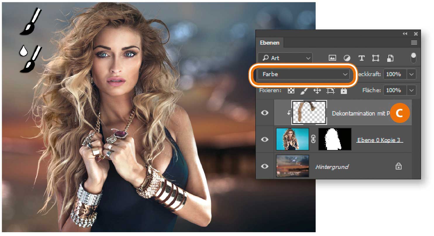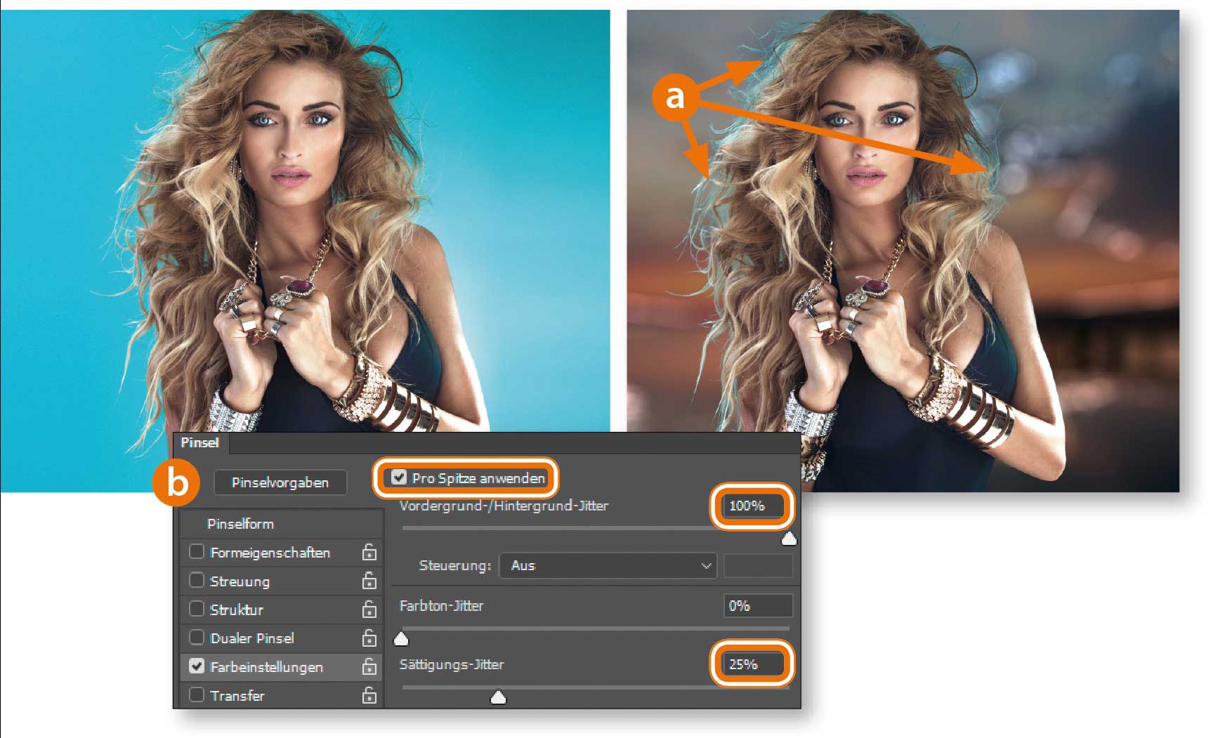 Legen Sie zunächst eine neue, leere Ebene als Schnittmaske an (»Ebene > Neu > Ebene«, »Schnittmaske aus vorheriger Ebene erstellen«, »Modus > Farbe«). Nehmen Sie mit dem »Pipette-Werkzeug« zwei unterschiedliche Farben aus den Haaren für die Vorder- beziehungsweise die Hintergrundfarbe auf. Aktivieren Sie den »Pinsel« und öffnen Sie das »Pinsel«-Bedienfeld (»Fenster > Pinsel«). Setzen Sie unter »Farbeinstellungen« den »Vordergrund-/Hintergrundjitter« auf 100 % und den »Sättigungsjitter« auf 25 %, um kleine Farbvariationen zu erzeugen (b). Bei kleinen Pinselspitzen sollten Sie diese Optionen jedoch abschalten, um unschöne Farbübergänge zu vermeiden. Malen Sie nun mit einer weichen Pinselspitze auf der zuvor angelegten Ebene über die umzufärbenden Bereiche (c).