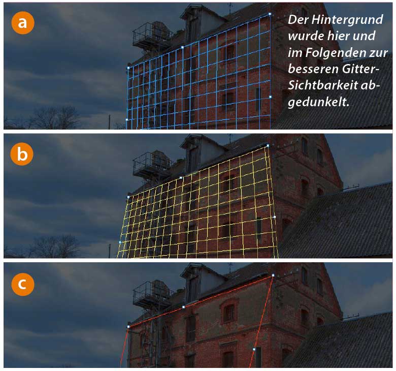 Wird das erzeugte Gitter in blauer Farbe angezeigt (a), laufen seine perspektivischen Linien nur auf einen einzelnen Fluchtpunkt zu. Ein gelbes Gitter ist dagegen ein Hinweis auf eine „Zwei-Punkt-Perspektive“ (b). Problematisch ist nur die Anzeige in roter Farbe: In diesem Fall entsprechen die Fluchtlinien keiner möglichen Perspektive und erfordern eine Korrektur (c).