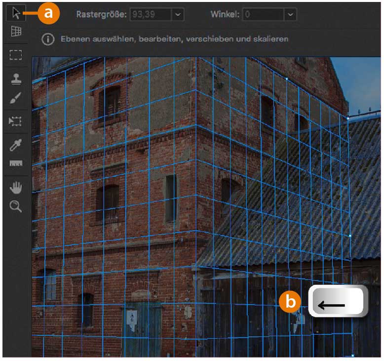 Wenn Sie im Filter »Fluchtpunkt« auf »OK« klicken und die Datei speichern, merkt sich Photoshop die erzeugten Fluchtpunkt-Gitter – unabhängig von Ebenen oder Kanälen. Um sie, falls nötig, loszuwerden, müssen Sie im Filter das »Ebene-bearbeiten-Werkzeug« (a) aktivieren, das Gitter anklicken und die »Rückschritt«-Taste (b) betätigen.