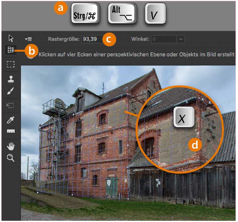 Nach dem Aufruf des Filters »Fluchtpunkt« (a) müssen Sie mit dem »Ebene-erstellen-Werkzeug« (b) ein perspektivisches Gitter erzeugen. Orientieren Sie sich dabei an den Fluchtlinien im Foto. Über »Rastergröße« (c) legen Sie die Linienabstände des Rasters fest. Mit der Taste »X« verdoppeln Sie vorübergehend die Zoomstufe, um die Gitterpunkte genauer zu platzieren (d).