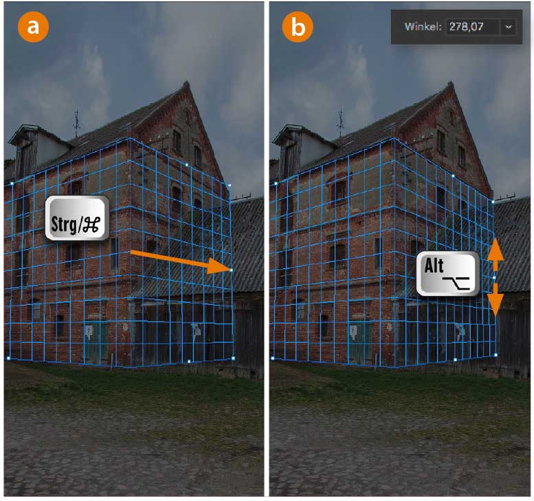 Wenn Sie einen der mittleren Anfasser bei gedrückter »Strg/Cmd«-Taste ziehen, verlängern Sie das Fluchtpunkt-Gitter in einem Winkel von 90° (a). Sollte das perspektivisch nicht passen, ändern Sie den »Winkel« – am einfachsten durch Klicken und Ziehen am mittleren Anfasser bei gedrückter »Alt«-Taste (b).
