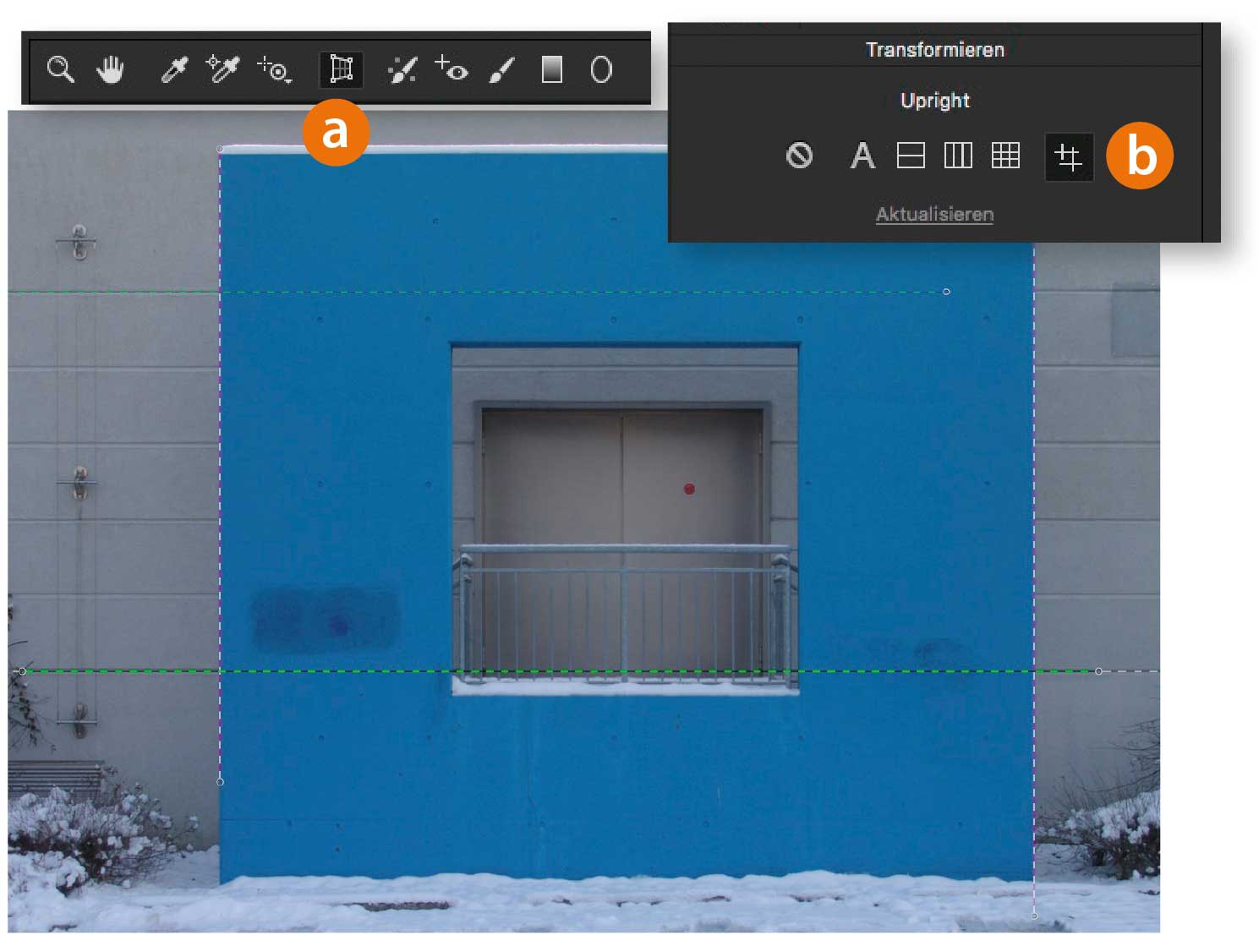 In Photoshop CC optimieren Sie die exakte Ausrichtung der Horizontalen und Senkrechten am einfachsten und genauesten in Camera Raw beziehungsweise im »Camera Raw-Filter« mit dem »Transformieren«-Werkzeug (a). Aktivieren Sie dort die Option »Mit Hilfslinien« (b) und ziehen Sie im Bild jeweils entlang zweier horizontal beziehungsweise vertikal auszurichtender Kanten Hilfslinien auf. Die Korrektur des Bildes sehen Sie sofort nach dem Anlegen der jeweils zweiten Hilfslinie.