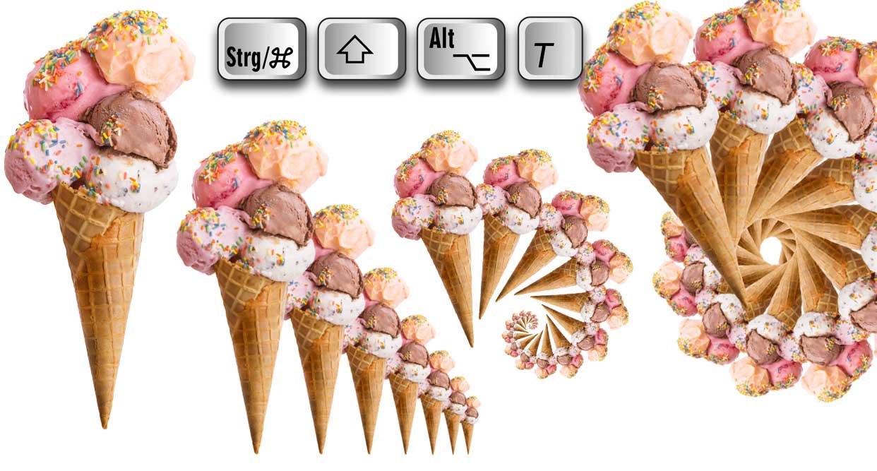 Duplizieren Sie die Objekt-Ebene zunächst (»Strg/Cmd-J«), transformieren Sie sie wie gewünscht und wiederholen Sie anschließend dieselbe Transformation beliebig oft mit »Strg/Cmd-Shift-Alt-T«. Je nach gewählter Skalierung, Rotation und Verschiebung können Sie schnell die unterschiedlichsten Ergebnisse erhalten.