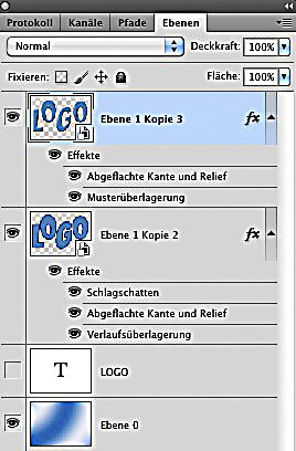 Um abschließend ein Rastermuster hinzuzufügen, erstellen Sie ein neues Dokument, ziehen einen linearen Schwarz-Weiß-Verlauf auf, gehen zu „Filter?>?Vergröberungsfilter?>?Farbraster“, stellen alle Rasterungswinkel auf 0 und den „Maximalen Radius“ auf 8. Wählen Sie mit dem Zauberstab („benachbart“ deaktivieren) die schwarzen Pixel aus. Verwandeln Sie durch einen Doppelklick auf die Hintergrundebene diese in eine normale Ebene. Löschen Sie die schwarzen Pixel. Wählen Sie „Alles“ aus und und speichern Sie unter „Bearbeiten?>?Muster festlegen“ als Muster. Gehen Sie wieder in Ihr „Logo“-Dokument zurück, wählen Sie die obere Ebene aus, rufen Sie die Ebenenstile auf, aktivieren Sie „Musterüberlagerung“ und wählen Sie Ihr neues Muster aus. Die Deckkraft im Beispiel wurde auf 80?% reduziert und als Füllmethode „Weiches Licht“ gewählt. Zum Schluss fügen Sie dem Schriftzug einen Hintergrund hinzu.