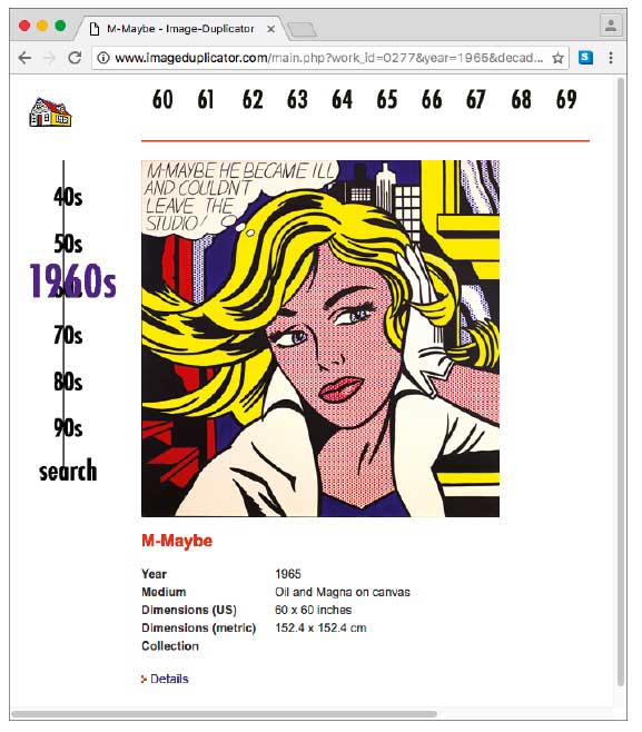 Ein typisches Beispiel ist Roy Lichtensteins Gemälde M-Maybe (1965), auch als Mona Lisa der Neuzeit bezeichnet. Es zeigt das Porträt einer blonden jungen Frau vor einem nicht näher bestimmten urbanen Setting, mit einer für Comics typischen Gedankenblase: „M-Maybe he became ill and couldn’t leave the studio“ („V-Vielleicht ist er krank geworden und konnte das Studio nicht verlassen“). Der Ausblick aus dem Fenster suggeriert ein teures Appartment und der elegante Handschuh eine gehobene Gesellschaftsschicht; die Erwähnung eines Studios lässt an einen kreativen Beruf des erwähnten Mannes denken.