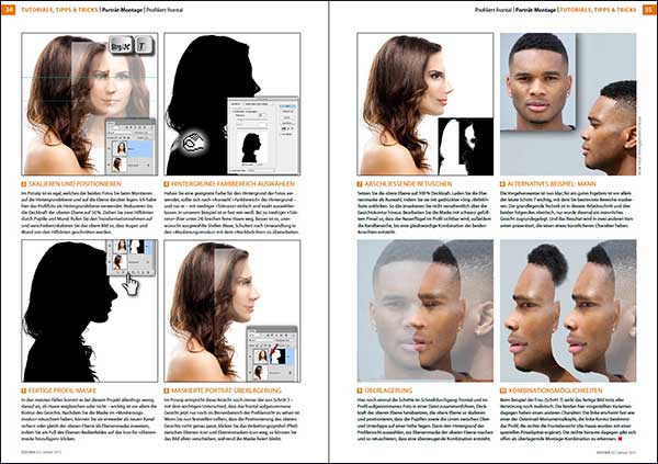 Die beiden Ausgangsfotos, die Sie für dieses Projekt aufnehmen (oder wie bei unserem Beispiel in einer Bilddatenbank wie Fotolia suchen), sollten zwei Bedingungen erfüllen: Zum einen ist ein gleichförmiger Hintergrund notwendig, der ausreichenden Kontrast zu Haut und Haaren des Modells aufweist (auch dort, wo gegebenenfalls Glanzstellen erscheinen). Ein solcher Hintergrund erleichtert Ihnen später (Schritt 4 und 5) das Freistellen der Profilansicht ganz erheblich.