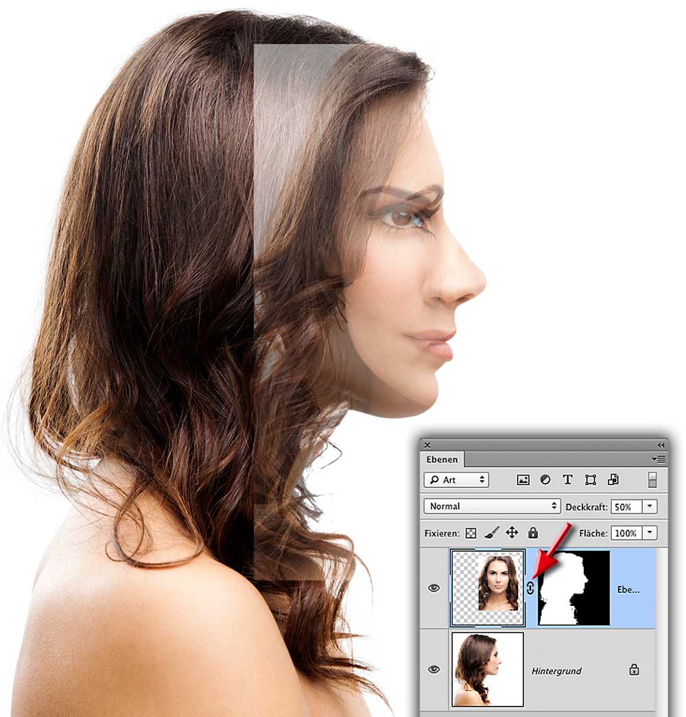 Im Prinzip entspricht diese Ansicht noch immer der von Schritt 3 – mit dem wichtigen Unterschied, dass das frontal aufgenommene Gesicht jetzt nur noch im Binnenbereich der Profilansicht zu sehen ist. Wenn Sie nun feststellen sollten, dass die Positionierung des oberen Gesichts nicht genau passt, klicken Sie das Verkettungssymbol (Pfeil) zwischen Ebenen-Icon und Ebenenmasken-Icon weg; so können Sie das Bild allein verschieben, während die Maske fixiert bleibt.
