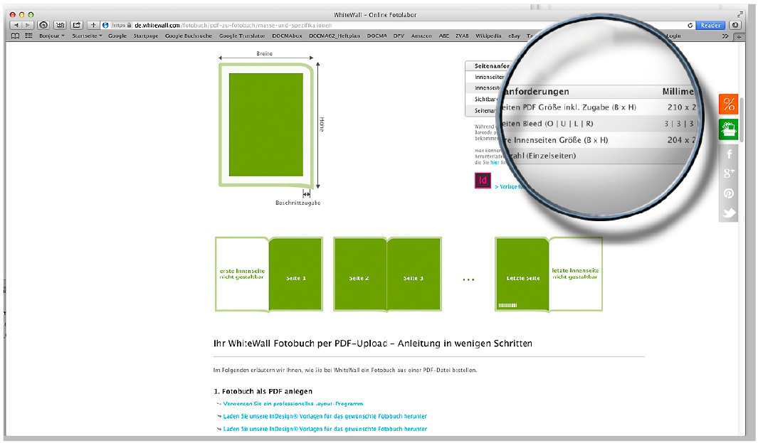 Öffnen Sie Whitewall-Seite und schauen Sie sich die Erklärungen und Spezifikationen unter „Ihr WhiteWall Fotobuch per PDF-Upload – Anleitung in wenigen Schritten“ genau an. (Nun, ganz so wenige Schritte sind es zwar nicht, aber nicht alle betreffen Ihr Projekt.) Sie vermeiden so, dass Ihre Daten nicht in der gewünschten Weise ausgedruckt werden können oder Sie ein Fotobuch erhalten, das nicht Ihren Vorstellungen entspricht. Es lohnt sich, diese Zeit zu investieren. Über der Anleitung finden Sie die „Seitenanforderungen“ Ihrer InDesign-Datei. Letztere können Sie direkt herunterladen.
