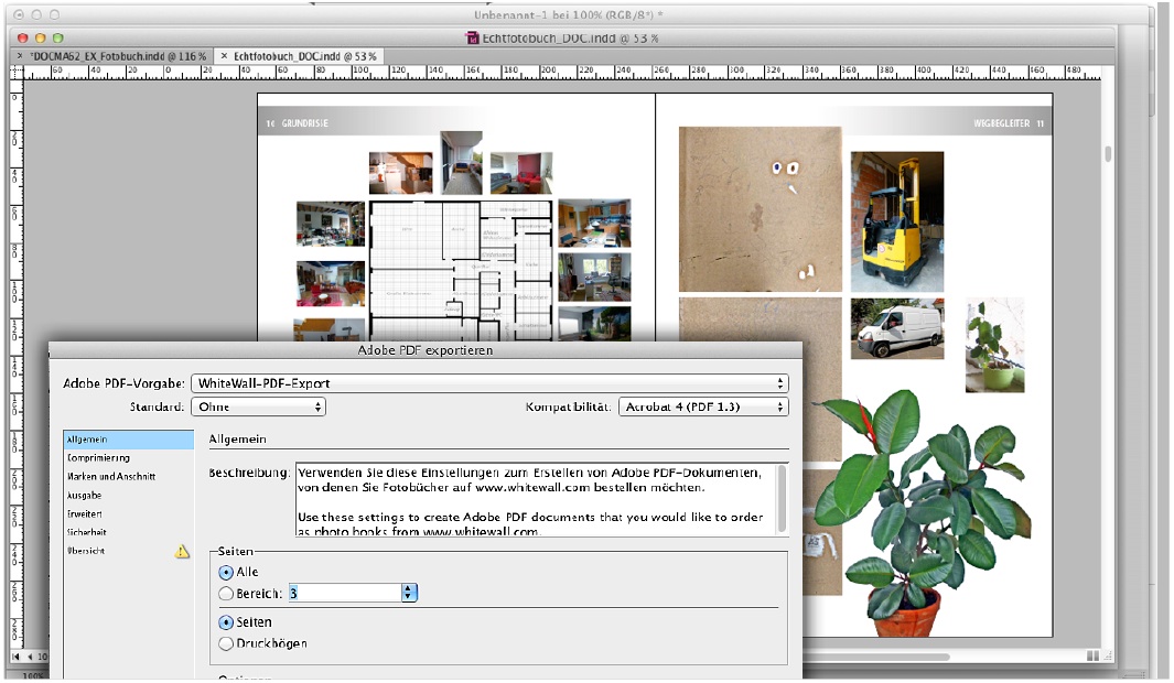 Haben Sie auf der Basis Ihrer Vorgaben die darauf aufbauenden InDesign-Dateien für Cover und Innenseiten heruntergeladen, beginnt die eigentliche Arbeit am Layout. Hier gibt es mit Ausnahme der Spezifikationen der „Anleitung“ nichts Besonderes zu beachten. Sie können alles das machen, was Sie für die Gestaltung Ihres Projekts brauchen. Da eine Beschnittzone vorgesehen ist, lassen sich auch angeschnittene Bilder oder Grafikelemente verwenden. Ist alles fertig, exportieren Sie das PDF aus der InDesign-Datei. Hier empfiehlt WhiteWall, die verfügbaren Joboptions zu verwenden, die Sie ebenfalls von der Webseite herunterladen können.