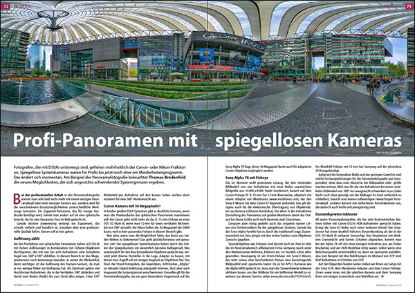 Wie das oben abgebildete Panorama mit der Sony Alpha 7R und einem Fisheye-Objektiv erstellt wurde, lesen Sie in einer Schritt-für-Schritt-Anleitung in der neuen DOCMA-Ausgabe, die Sie im Zeitschriftenhandel bekommen und in unserem Webshop bestellen können. Wenn Sie sofort weiterlesen möchten, kaufen Sie sich im Webshop die PDF-Version des Heftes.
