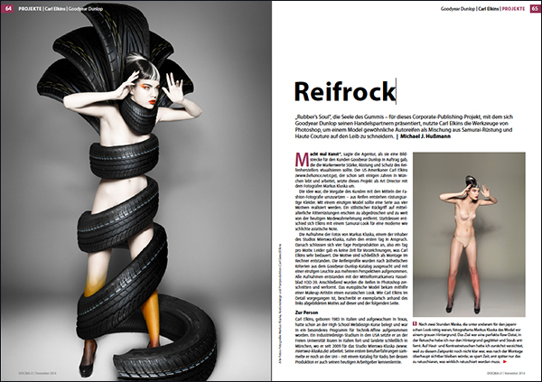 Für ein Werbe-Projekt von Goodyear Dunlop schneiderte Carl Elkins einem Model mit Photoshop gewöhnliche Autoreifen als Mischung aus Samurai-Rüstung und Haute Couture auf den Leib.