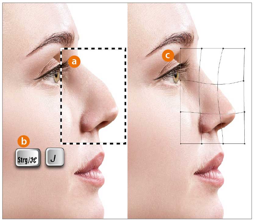 Wählen Sie dazu die Nase grob mit dem »Auswahlrechteck-Werkzeug« aus (a) und kopieren Sie den Bereich mit »Strg/Cmd-J« (b) auf eine neue Ebene. Rufen Sie »Verformen« auf und schieben Sie über die inneren Gitterlinien die Nasenkontur in Position (c). Ändern Sie nicht den äußeren Rahmen des Verformengitters, damit Sie keine Anschlussfehler zu den Kanten außerhalb der ursprünglichen Auswahl erzeugen.