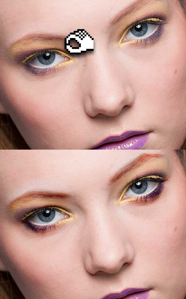 Nutzen Sie den »Korrekturpinsel« in »Camera Raw«, den »Nachbelichter« in Photoshop oder andere Dodge & Burn-Techniken, um die Umgebung des Auges abzudunkeln. Achten Sie darauf, eventuell vorhandene, dunkle Tränensäcke nicht zu verstärken. Beschränken Sie das Abdunkeln auf Augenbrauen und Wimpern, falls Sie keinen Smokey-Eyes-Schminkeffekt erzielen möchten.