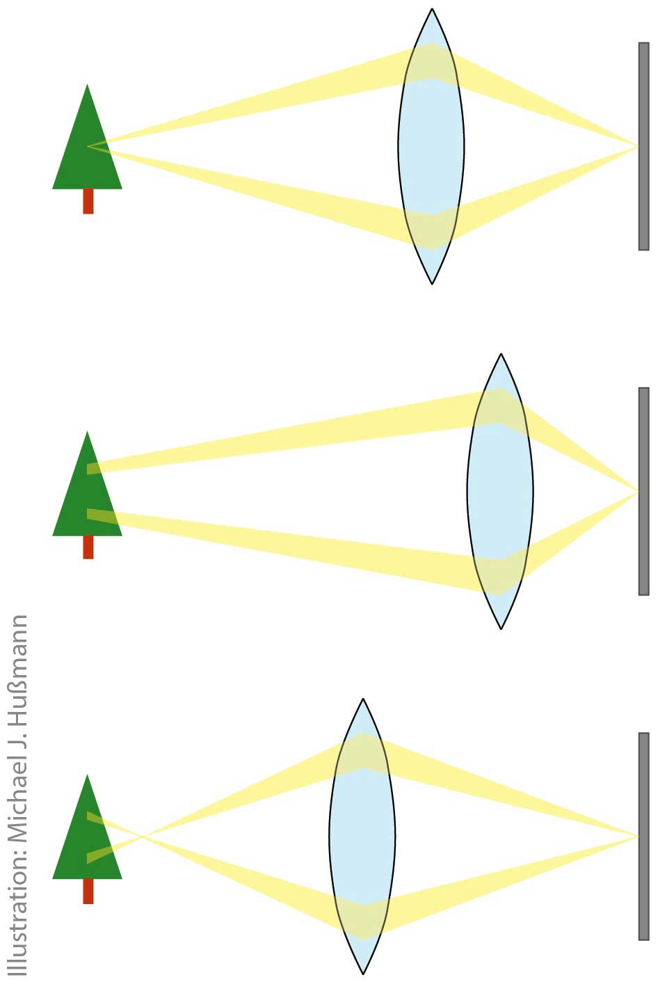Motivs je nach dem Weg, den sie durch das Objektiv zurücklegen, an einer anderen Stelle auf den Film (oder heute den Sensor), was ein unscharfes Bild ergibt. Die Lichtstrahlen, die dann auf denselben Punkt des Films oder Sensors treffen, müssen folglich von unterschiedlichen Punkten des Motivs kommen.