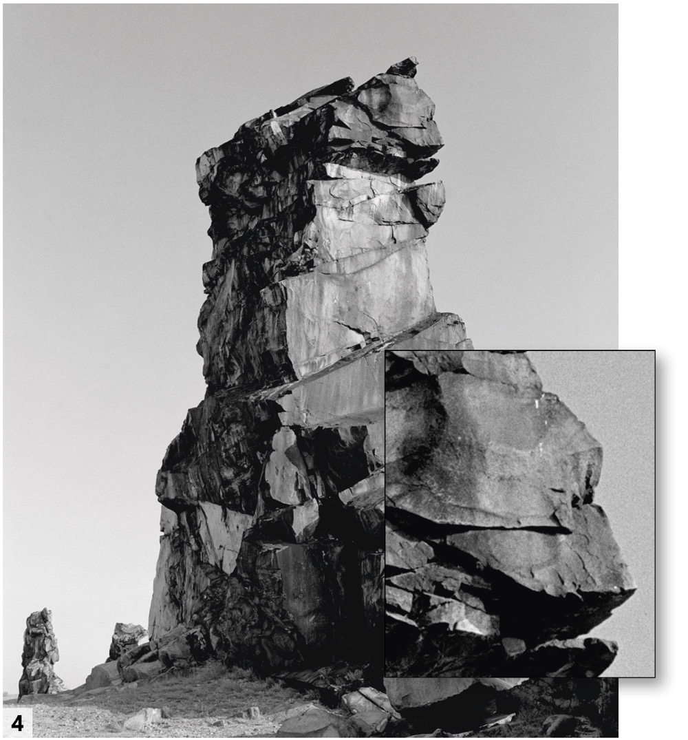 Der steil aufragende Felsen bietet die ganze Palette der Graustufen. Der Ausschnitt zeigt das Korn des Kodak Tri-X-Films mit ISO 400. Foto: André Giogoli