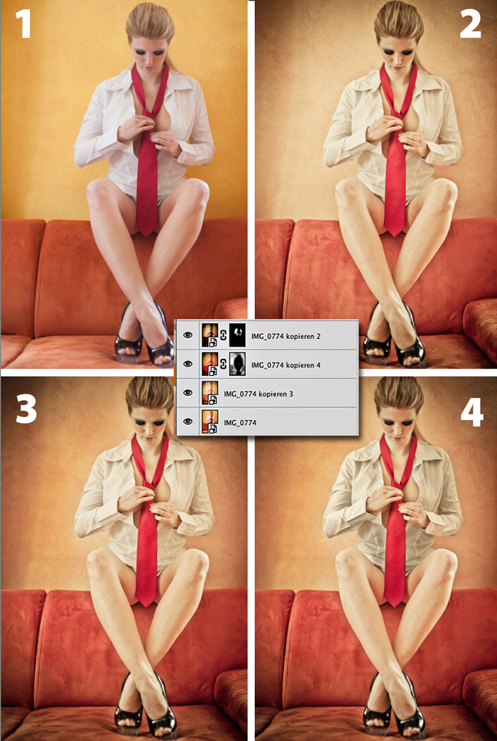 Als ich nun bei der geplanten Ausarbeitung einer Raw-Datei [1] feststellte, dass praktisch wäre mehrere verschiedene Raw-Entwicklungen zu kombinieren, erinnerte ich mich an den Artikel. Ich vermischte zunächst eine farblichen Vorentwicklung [2] an den Rändern mit einer etwas dunkleren und gesättigteren Entwicklungsversion [3]. Im letzten Schritt arbeitete ich die Plastizität des Hemdes in der vierten Raw-Entwicklung aus [4]. Der enorme Vorzug dieser Methode gegenüber anderen liegt in zwei Aspekten: Zum einen kann ich auf alle Entwicklungen jederzeit die ganze Batterie der Raw-Werkzeuge anwenden und sie so finetunen. Zum anderen arbeite ich dabei mit maximaler Datentiefe und habe so keine unnötigen Tonwert- oder Qualitätsverluste.