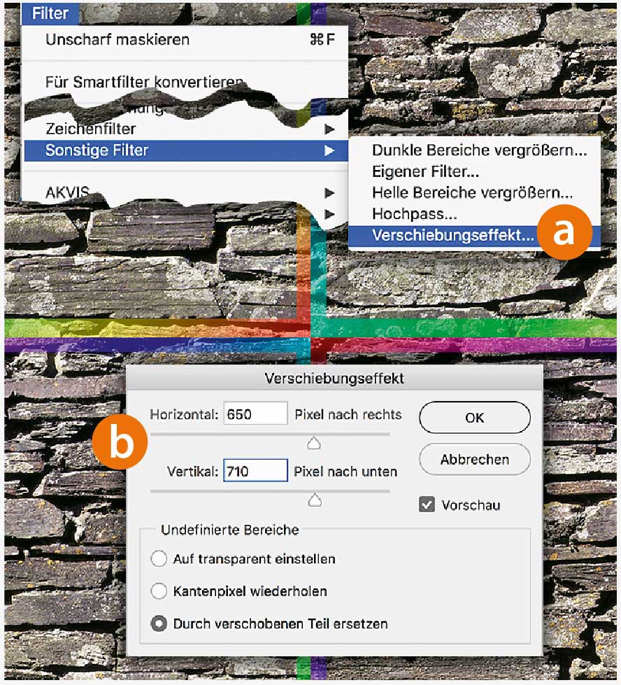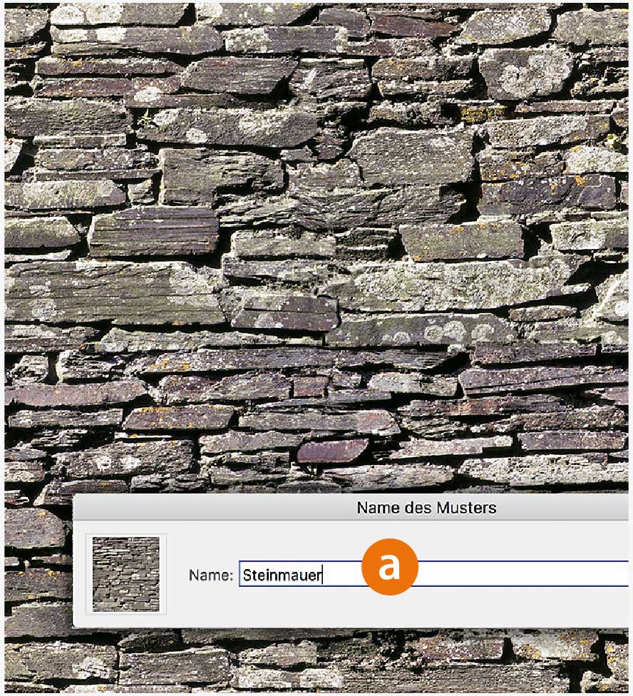 Mit unterschiedlichen Methoden – Stempel, Duplizieren einzelner Steine – lassen Sie die beiden Bruchkanten verschwinden. Wenden Sie zur Kontrolle den »Verschiebungseffekt« erneut an. Sichern Sie das Muster unter »Bearbeiten > Muster festlegen« und benennen Sie es (a).