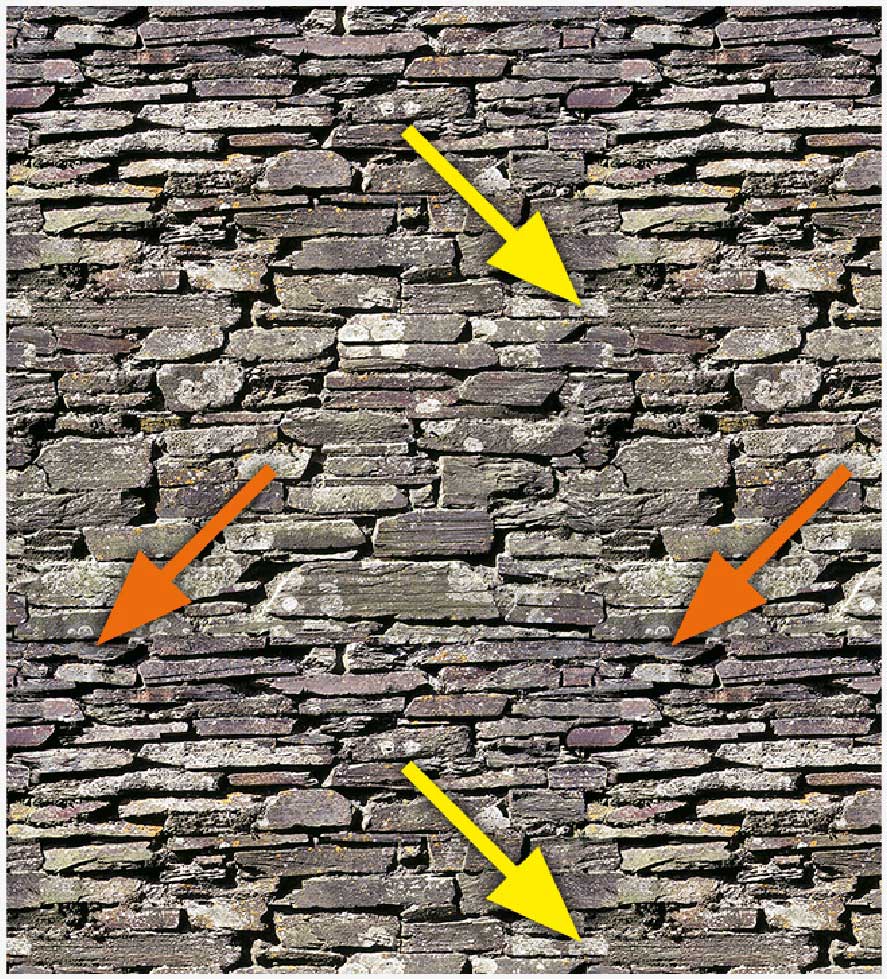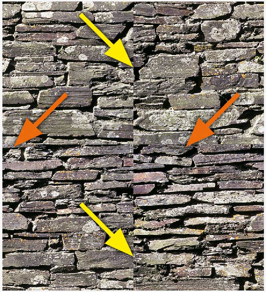 Alle Außenkanten des Bildes würden nun automatisch bruchlos an Ihre Nachbarn anschließen, wenn dies bereits ein Muster wäre, da die Pixel ja nur verschoben wurden. Retuschieren müssen Sie die harten Bruchkanten im Binnenbereich; die Pfeile zeigen ihre Position an.