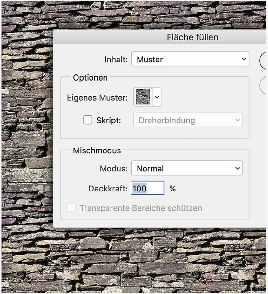 Unter »Bearbeiten > Fläche füllen«, alternativ unter »Ebenenstil > Musterüberlagerung«, wählen Sie das vorbereitete Muster und setzen es für die Füllung ein. Die repetitiven, rechteckigen Elemente bilden nun neben- und untereinander eine durchgängige Struktur ohne sichtbare Brüche.