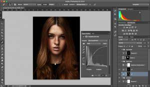 Für das Dodge & Burn erzeugte ich zwei Einstellungsebenen des Typs »Gradationskurven« mit aufgehellten beziehungsweise abgedunkelten Mitteltönen; die Wirkung beider Ebenen blendete ich zunächst durch eine schwarze Maske aus. Die oben beschriebene Hilfskonstruktion zeigte mir, welche Bereiche des Bildes aufgehellt oder abgedunkelt werden mussten, und dort malte ich den gewünschten Effekt mit weißer Farbe in die Maske der jeweiligen Einstellungsebene ein. Besonders wichtig ist hierbei das Micro-Dodge & Burn (siehe DOCMA 58 ab Seite 44), bei dem man alle Stellen ausgleicht, die für eine homogene Hautstruktur zu dunkel oder zu hell sind. Das kann sehr lange dauern – bei einem Beauty-Bild sind es typischerweise vier bis fünf Stunden; in einem Fall habe ich sogar schon 13 Stunden auf das Dodge & Burn verwendet.