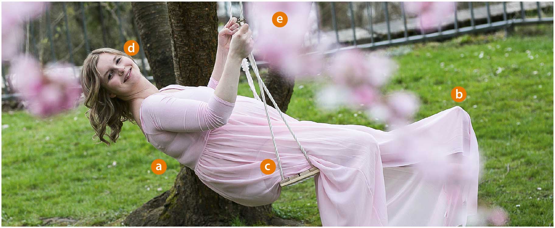 DOCMA-Leser Franco wendete sich mit folgender Frage an Doc Baumann: „Hallo Doc, ich habe nach einem Babybauch-Shooting mit einem der Bilder (oben) Probleme. Ich hoffe, dass man die mit PS lösen kann. Als da wären: Falten am Rücken entfernen (a), Füße strecken (b), Slip farblich so anpassen, dass man ihn nicht mehr sieht (c), das Schlupflid öffnen (d), sowie mehr – separat aufgenommene – Kirschblüten platzieren (e); (da weiß ich weder, wie man die am besten freistellt, noch, ob es besser ist, sie scharf oder unscharf zu fotografieren). Ich freu’ mich schon auf deine Ideen und wünsche einen schönen Tag, Franco“