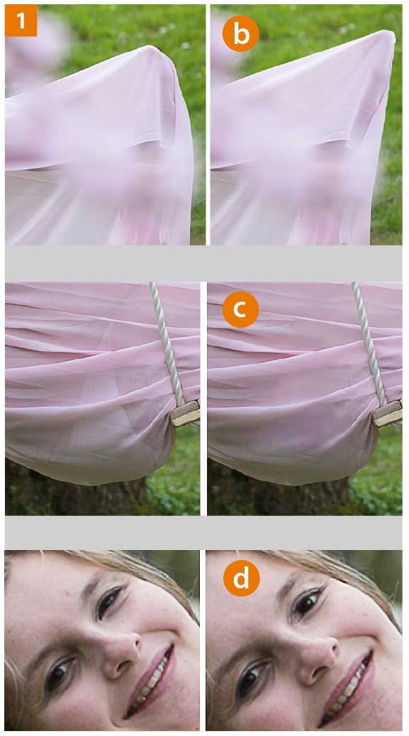 Die genannten Problemstellen sehen Sie im Bild oben; rechts drei davon noch einmal vergrößert. Legen Sie für jede Korrektur neue Ebenen an. Die Falten am Rücken (a) lassen sich am schnellsten durch Retuschieren mit dem Stempel bei geringer Deckkraft entfernen (a). Für die zu streckenden Füße setzte ich im ersten Schritt »Bearbeiten > Transformieren > Formgitter« ein, danach das »Mitziehen«-Werkzeug aus »Verflüssigen« (b). Der Slip verschwand durch Malen mit Werten benachbarter Pixel auf einer Ebene im Modus »Luminanz« und einer weiteren mit »Farbe« (c). Das Auge öffnete ich behutsam ebenfalls per »Verflüssigen«, duplizierte dann den Augapfel des anderen Auges und retuschierte ihn passend (d). Zusätzliche – übrigens scharf fotografierte – Kirschblüten übertrug ich aus einem weiteren Foto und wandte auf die Ebene den »Gaußschen Weichzeichner« an (e).