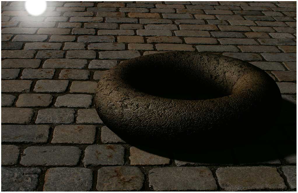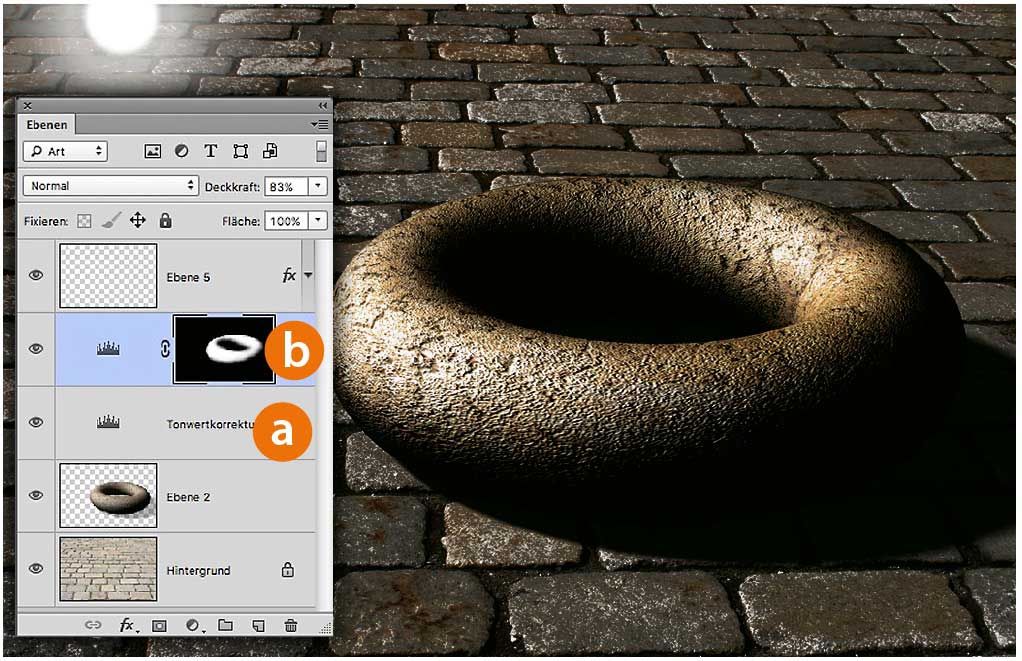 Für die nachträgliche Beleuchtung gibt es mehrere Verfahren; ihre jeweilige Eignung hängt auch von den Ausgangsbedingungen ab. In diesem Bild wurden – ebenso wie bei Bild 1 – Hintergrund- und Torus-Ebene zunächst mit einer »Tonwertkorrektur«- Einstellungsebene stark abgedunkelt (a). Soll die Beleuchtung nicht heller werden als die ursprüngliche, könnten Sie der Einstellungsebene eine Ebenenmaske zuweisen, die die hellen Zonen ausspart. Hier habe ich eine stark aufhellende »Tonwertkorrektur«-Ebene ergänzt und den zu beleuchtenden Bereich in der Ebenenmaske weiß ausgemalt (b). »Ausblenden/Mischen wenn« für die abdunkelnde Ebene erlaubt die Aufhellung der Pflastersteine.