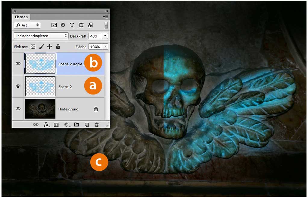 Auch bei diesem Bild kam zunächst eine überlagernde Mal-Ebene im »Mischmodus > Ineinanderkopieren« zum Einsatz. Dabei müssen Sie beachten, dass dieser Modus es nicht erlaubt, dunkle Bereiche des Hintergrundbildes mit hellen Farben der oberen Ebene aufzuhellen. Sie sind also an die ungefähre Originalbeleuchtung gebunden. Und Sie können auch nicht wie in Bild 3 »Negativ multiplizieren« verwenden und dann dunkle Bereiche ausblenden. In einem solchen Fall bliebe also nichts anderes übrig, als im Modus »Normal« zu arbeiten. Hier wurde die Beleuchtungsrichtung beibehalten, so dass das genannte Problem nicht entsteht. Weil die Wirkung der bemalten »Ineinanderkopieren«-Ebene (a) nicht ausreicht, wurde sie dupliziert, dann das Duplikat auf 40 % Deckkraft gesetzt (b). Die linke Bildhälfte (c) zeigt das Relief ohne Zusatzbeleuchtung.