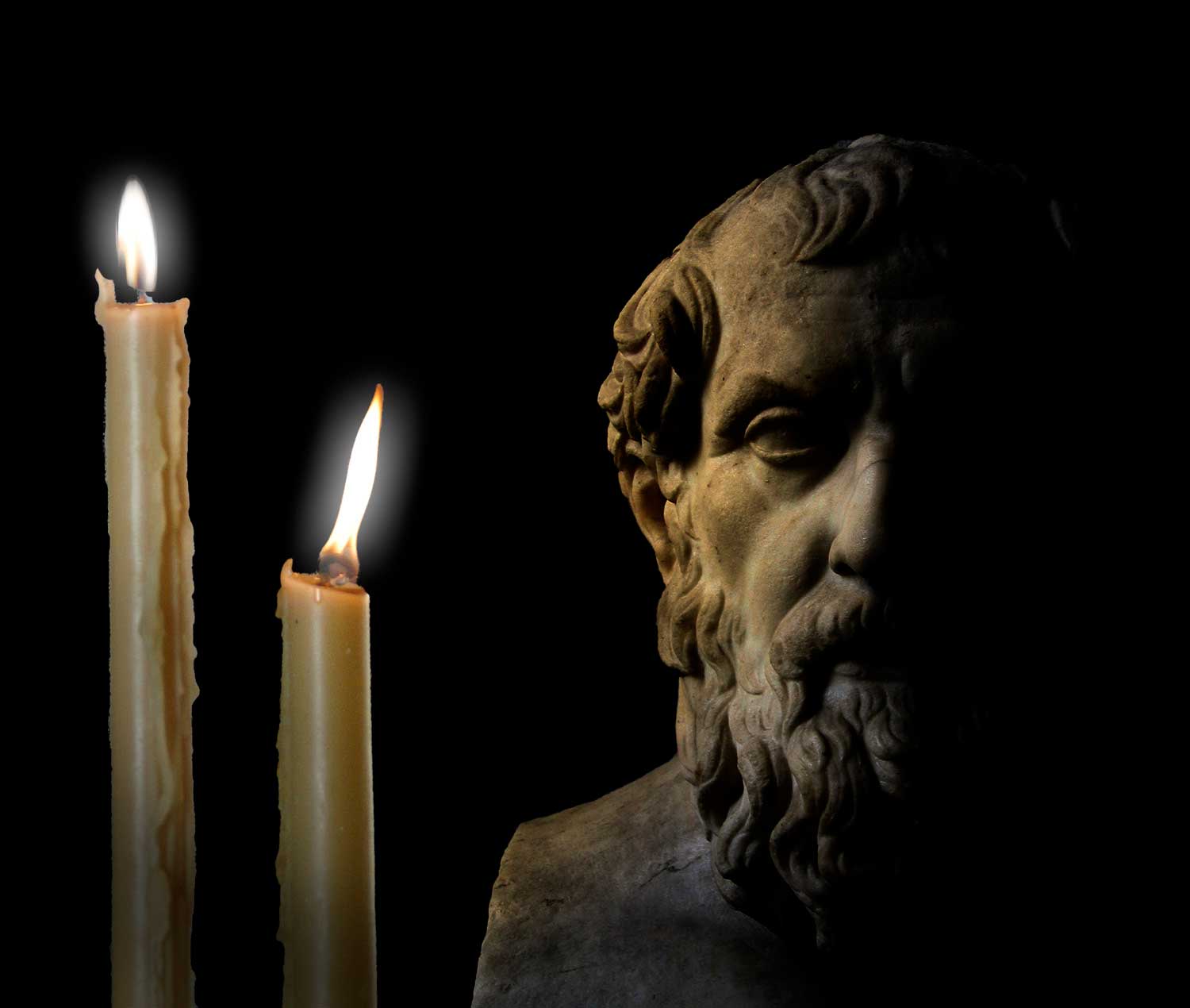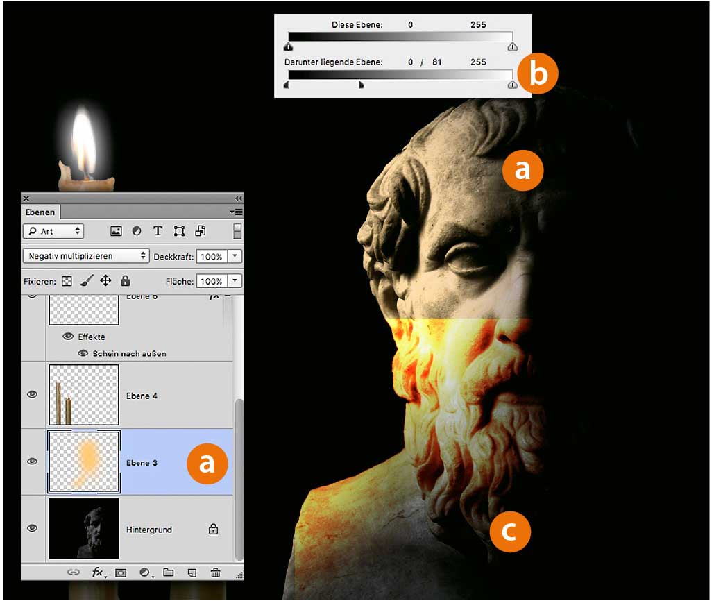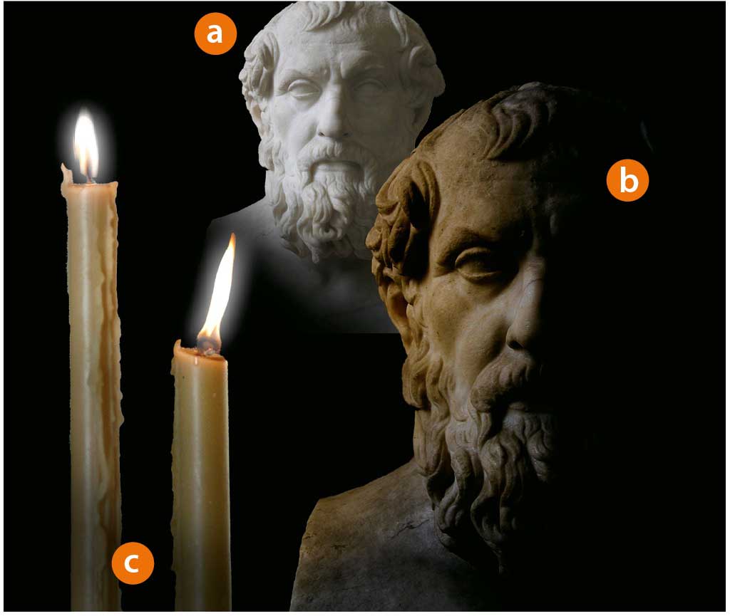 Je nach eingeplanter Lichtquelle ist es wichtig, deren Helligkeitsverteilung zu berücksichtigen. Bei parallel einfallendem Tageslicht sieht ein beleuchteter Gegenstand anders aus als bei Lampenlicht, und eine schwache Lichtquelle wie eine Kerze ruft wiederum eine andere Wirkung hervor. Das Licht breitet sich um eine punktförmige Quelle kugelförmig aus, und je weiter eine bestrahlte Oberfläche von dieser Quelle entfernt ist, um so schwächer wird sie beleuchtet. Hinzu kommt, dass das Licht hier nicht weiß ist, sondern gelb-orange. Um das Ergebnis effektvoller zu gestalten, wurde das Bild der Büste (a) stark abgedunkelt (b), dann die Lichtaufhellung nach Montage der Kerzen (c) auf einer Ebene gemalt.