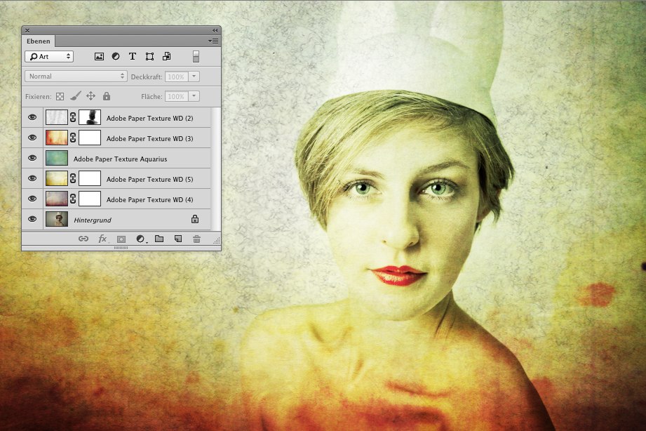 Das Geheimnis interessanter Textur-Überlagerungs-Effekte (die übrigens nur einen Teil der vorgestellten Effektvielfalt ausmachen) liegt in der Kombination mehrerer Texturen. Diese werden in mehreren Ebenen auf das Bild gelegt und erzeugen durch den Einsatz verschiedener Ebenenmodi und die unterschiedlicher Farben, Strukturen und Helligkeiten ein Eigenleben, das viele – auch die etwas langweilig geratenen – Motive veredelt.