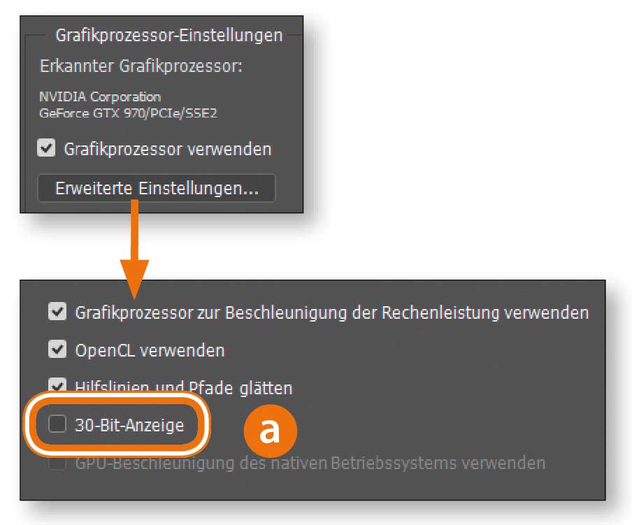 Photoshop erlaubt jedoch – im Gegensatz zu den meisten anderen Programmen – zumindest 10 Bit/Kanal darzustellen über »Voreinstellungen > Leistung > Grafikprozessor-Einstellungen > Erweiterte Einstellungen > 30-Bit-Anzeige« (a). Damit ist die Darstellung frei von sichtbaren Tonwertabrissen. Voraussetzung ist jedoch, dass die gesamte Bildwiedergabe-Kette auch zu 10 Bit/Kanal in der Lage ist. Dazu gehören Software-Komponenten wie Betriebssystem, Grafiktreiber und Bearbeitungsprogramm (Photoshop), aber auch geeignete Hardware, wie 30-Bit-fähige Grafikkarte (AMD: Fire GL; Nvidia: Quadro) und Monitor. Sind diese Bedingungen nicht komplett erfüllt, können Sie nicht sicher sein, ob die Tonwertabrisse tatsächlich in der Datei vorhanden oder lediglich ein Artefakt unzureichender Farbtiefe der Bildschirm-Darstellung sind.