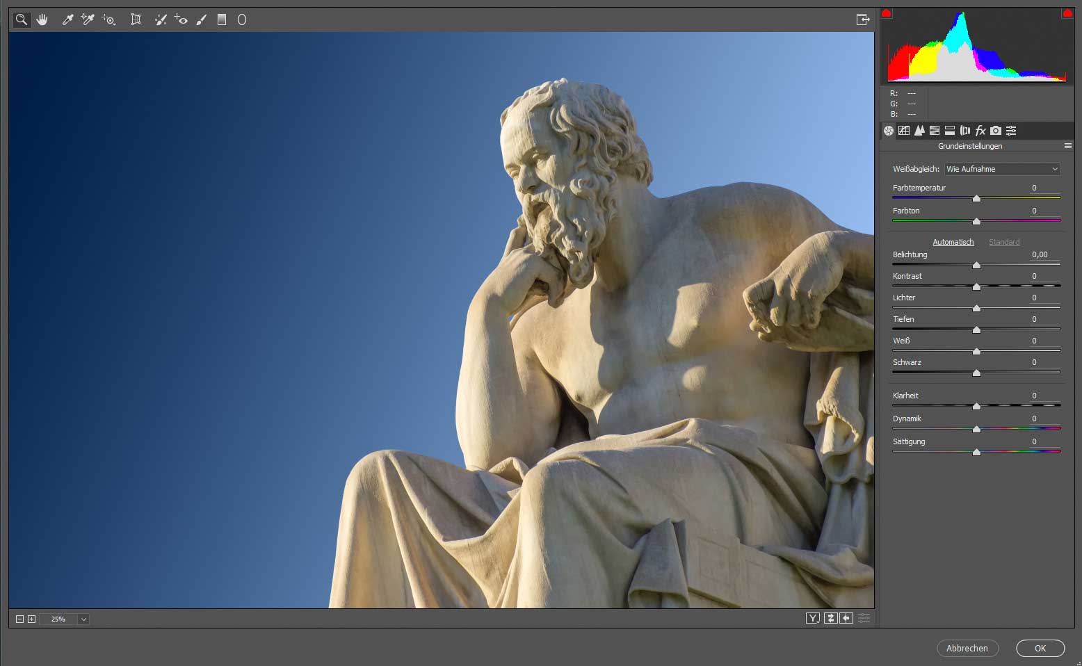 Bei aufwendigen Retuschen in Photoshop gibt es einen Trick zur Banding-Kontrolle: Öffnen Sie Ihr Bild dazu kurz im »Camera Raw-Filter«. Besteht das Bild aus mehreren Ebenen, müssen Sie es zuvor auf eine Ebene bringen: Aktivieren Sie die oberste Ebene und drücken Sie anschließend »Strg/Cmd-Alt-Shift-E«, um das Bild auf einer neuen Ebene zusammenzufassen. Anschließend wählen Sie »Filter > Camera Raw-Filter«. Überprüfen Sie das Bild hier auf eventuelle Tonwertabrisse und klicken Sie danach auf »Abbrechen«, um zu Photoshop zurückzukehren.