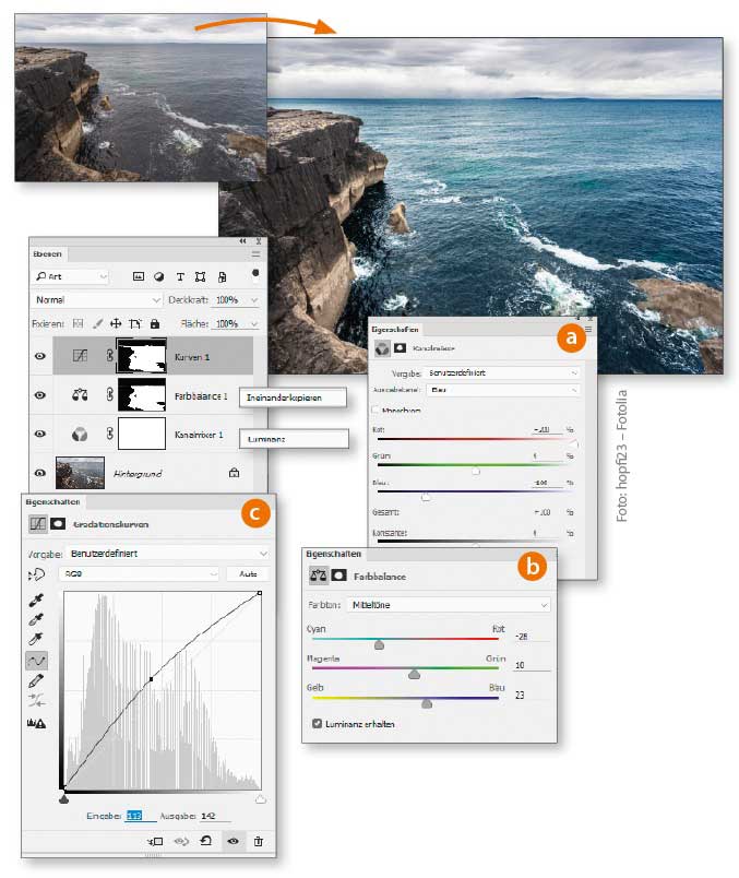 Wählen Sie die Wasserbereiche mit dem »Schnellauswahlwerkzeug« aus und legen Sie eine »Farbbalance«-Einstellungsebene im Modus »Ineinanderkopieren« an. Verstärken Sie Cyan und Blau im Bereich der »Mitteltöne« (b). Optimieren Sie gegebenenfalls die Maskenkanten.