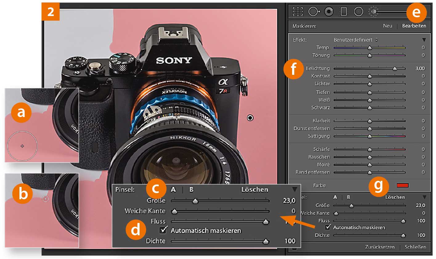 Wenn Sie Objekte freistellen müssen, um beispielsweise einen weißen Hintergrund einzuziehen [1], können Sie das meistens auch mit den Werkzeugen in Lightroom erledigen. Hierzu wählen Sie im Modul »Entwickeln« den »Korrekturpinsel« (»K«) aus [2 e]. Mit einer starken Aufhellung [2 f] malen Sie nun von außen am Objekt entlang. Die standardmäßig rote Einfärbung [2 g] hilft dabei. Wichtig für diesen Zweck ist die Option »Automatisch maskieren« [2 d], die sich sozusagen die Kanten selbst sucht. Für größere Flächen lässt sich ein Pinsel mit einem größeren Durchmesser [5 a] unter »A« [2 c] einrichten, während man kleinere Details und Ecken gut mit einem kleineren Pinsel [2 b] maskieren kann. Diesen legen Sie als Pinsel »B« an [2 c]. Haben Sie versehentlich das Objekt selbst übermalt, so können Sie es mit dem Pinsel »Löschen« wieder herausmalen. Zwischen »A« und »B« schalten Sie mit der Taste »<« um, die Löschfunktion des Pinsels aktivieren Sie mit der »Alt«-Taste. Die Regler für »Dichte« und »Fluss« bleiben meist auf 100, die »Weiche Kante« auf 0.