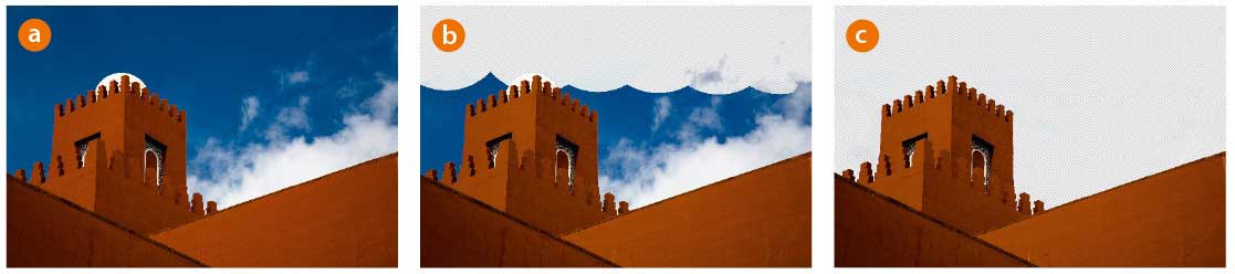 Bei kontrastreichen Kanten (a) bietet sich der Einsatz des »Hintergrund-Radiergummis« an. Damit löschen Sie wie mit dem herkömmlichen »Radiergummi« Teile des Bildes. Im Gegensatz zu diesem stellen Sie beim »Hintergrund-Radiergummi« in den Optionen einen Toleranzwert ein. Alles, was sich im Löschkreis befindet und farblich innerhalb der Toleranzgrenze liegt, wird gelöscht. Dabei ist nicht der Cursorkreis für den Toleranznullpunkt ausschlaggebend, sondern das Fadenkreuz in dessen Mitte. Entscheidend für das Verhalten sind auch die Wahl von »Aufnahme« und »Grenzen« in den Werkzeugoptionen. Im Beispielbild bleibt nach dem Einsatz des »Hintergrund-Radiergummis« bei einem Toleranzwert von 50 Prozent lediglich ein leichter Farbschatten des Mondes zurück (b). Dieser lässt sich mit einer geringeren Toleranz von 5% oder dem Wechsel auf das herkömmliche Radiergummi bei geringerer Größe mit einigen wenigen Mausklicks entfernen (c). Freistellen mit dem Hintergrund-Radiergummi – ganz einfach!