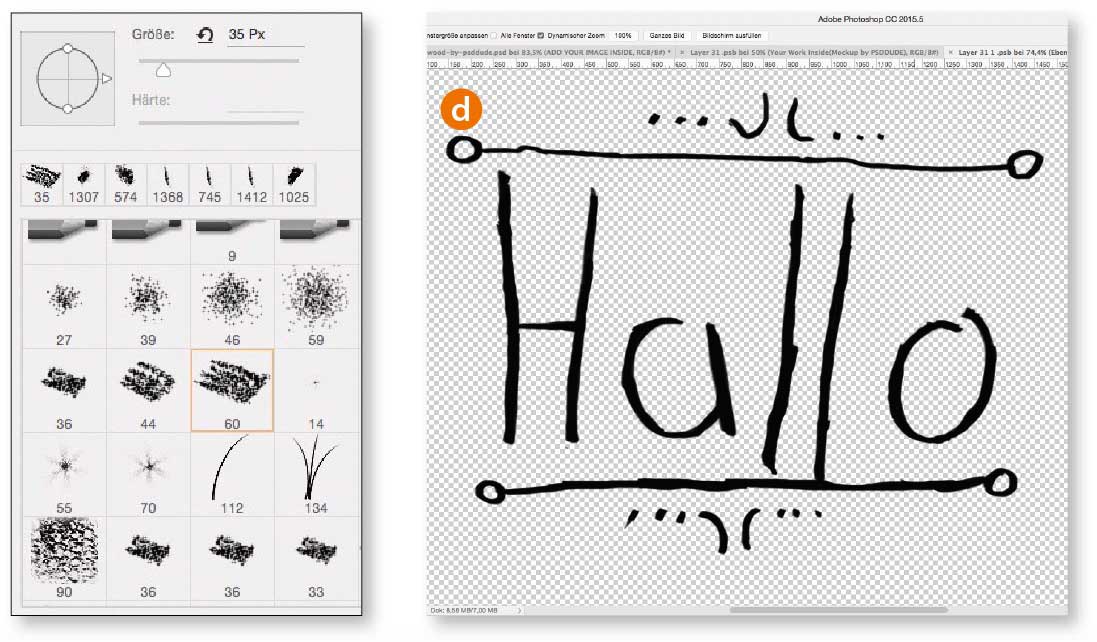 Doppelklicken Sie auf das Vorschaubild der obersten Smartobjekt-Ebene namens „Add your image inside“ (b). Im sich anschließend öffnenden Fenster doppelklicken Sie wiederum auf das oberste Smartobjekt „Your Work Inside (Mockup by PSDDUDE)“ (c). Fügen Sie hier auf neuen Ebenen eigene grafische Elemente hinzu. Weniger glatt-digital wirkt die Gravur, wenn Sie nicht einfach scharfkantigen Text mit dem Textwerkzeug hinzufügen, sondern ihn mit einigen Unregelmäßigkeiten auf einer leeren Ebene mit schwarzer Farbe und einer raueren Pinselspitze versehen (d). Schließen und speichern Sie beide Smartobjekte, um die fertige Holzschnittmontage inklusive Gravur-Werkzeug zu erhalten.