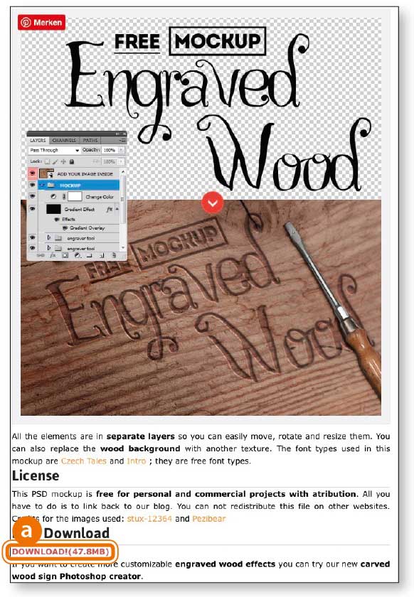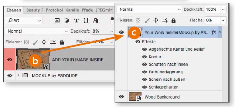 Unter www.docma.info/20785 laden Sie sich die Photoshop-Mock-up-Datei auf Ihren Rechner (a). Sie verspricht einen recht realistischen Gravur-Effekt, für den Sie nicht an echten Brettern herumschnitzen müssen.
