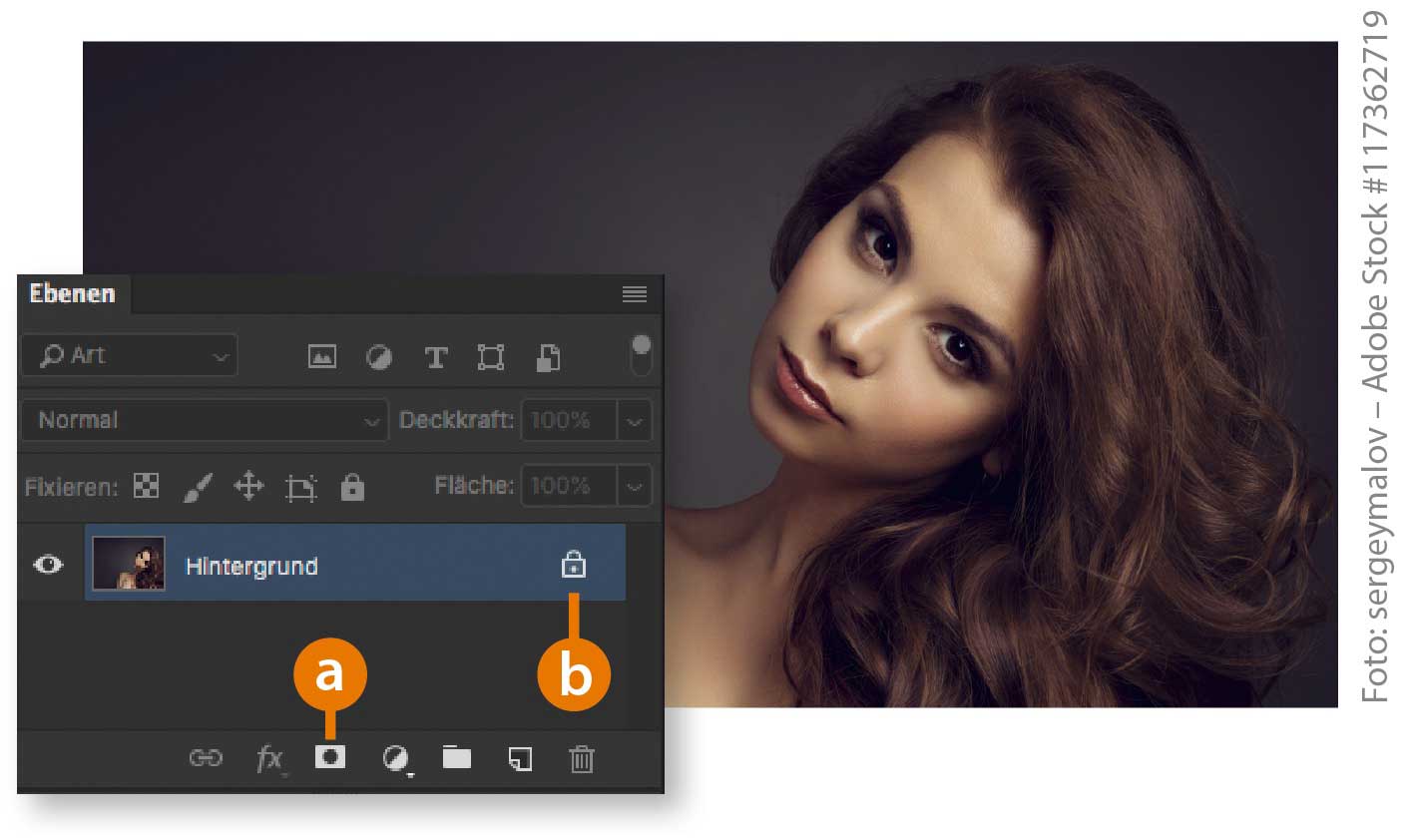 Fügen Sie der Bildebene eine Ebenenmaske hinzu (a). In aktuellen Photoshop-Versionen funktioniert das auch bei einer Hintergrundebene. In älteren Photoshop-Versionen müssen Sie die Hintergrundebene zuvor entsperren, indem Sie mit gehaltener »Alt«-Taste doppelt auf das Schlosssymbol klicken (b).