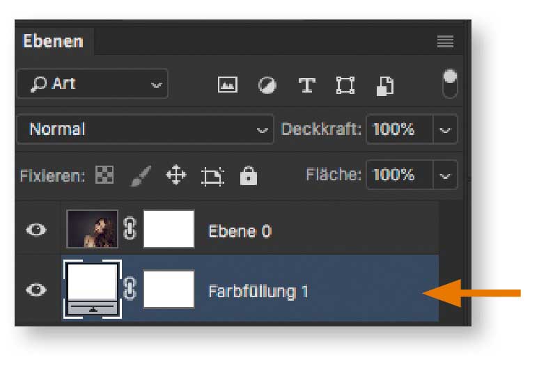 Fügen Sie unter der Bildebene einen neuen Hintergrund ein. Dieser sollte sich in der Helligkeit von Ihrem Bild unterscheiden. In diesem Beispiel wurde deshalb eine weiße Farbfläche gewählt (»Ebene > Neue Füllebene > Farbfläche«). Sie können statt eines einfarbigen Hintergrunds aber auch Verläufe, Muster oder andere Fotos einfügen.