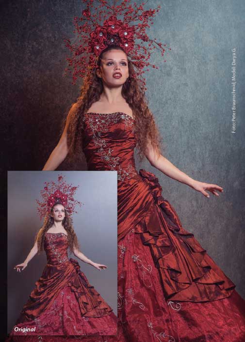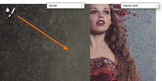 Ich fotografiere Modelle für Composings nach Möglichkeit vor einem grauem Hintergrund, denn so lässt sich ein neuer Hintergrund nachträglich schnell mit verschiedenen Füllmethoden einfügen. Für das Überlagern mit einer einfachen Textur verwende ich häufig die Mischmodi »Weiches Licht« oder »Ineinanderkopieren« – in manchen Fällen aber auch »Multiplizieren« (mehr darüber und zum Thema Quick-Composing finden Sie in DOCMA 67 ab Seite 20). Wenn die Textur homogen ist und keine kräftigen Details oder Luminanzsprünge aufweist, überlagere ich damit einfach das gesamte Bild und verwische die Details der Textur mit dem »Mischpinsel« an den Stellen, an denen Sie das Model unschön überlagern. So ist ein Schnellcomposing ohne jede Maske in wenigen Minuten fertiggestellt. Achtung: Die Methode funktioniert zwar sehr schnell, ist aber destruktiv. Achten Sie darauf, an den Kanten des Models möglichst genau zu malen.