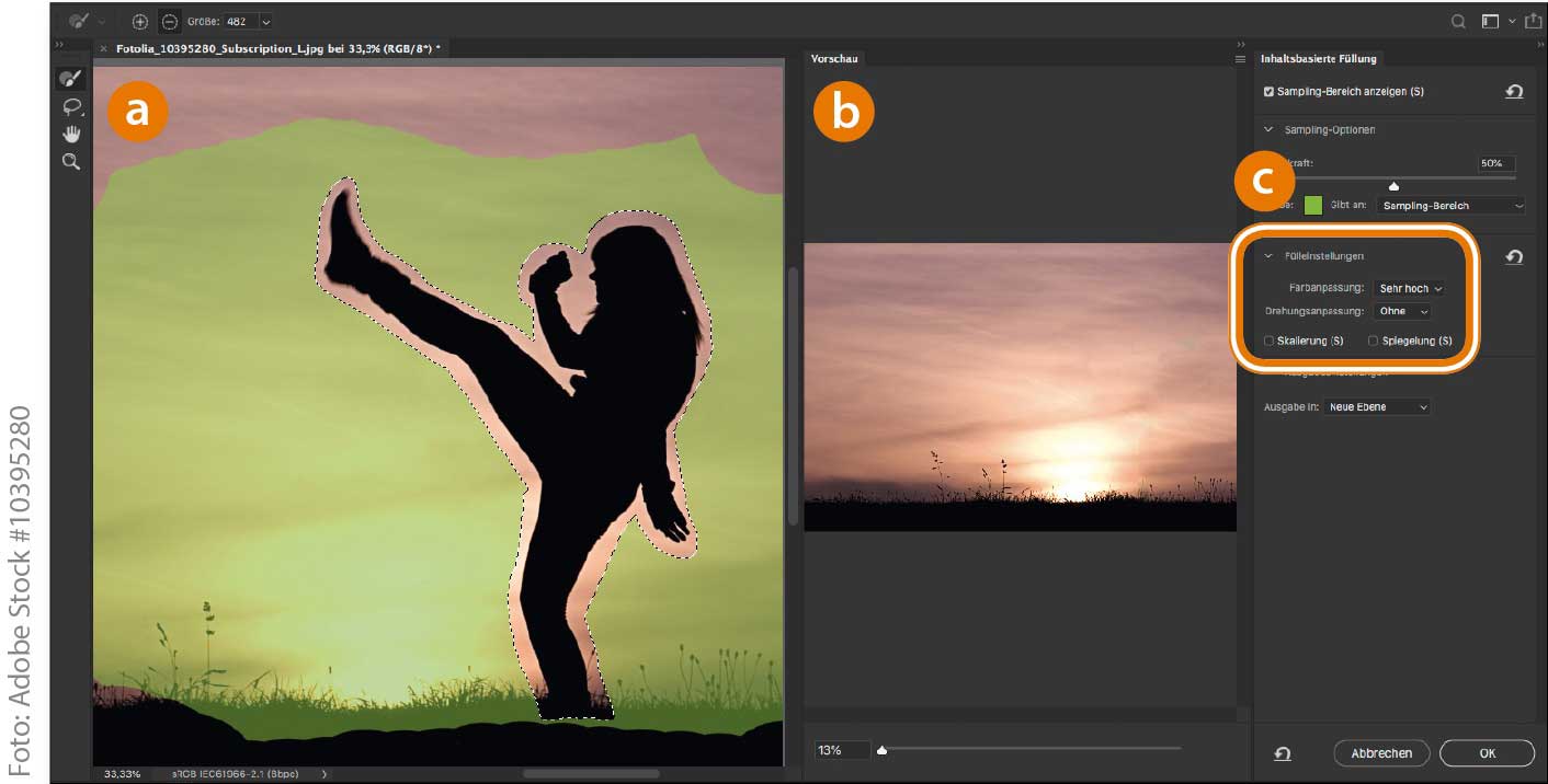 Neben dem alten inhaltsbasierten Füllen hat Photoshop nun einen neuen Arbeitsbereich für das Entfernen von Bildelementen eingeführt, den Sie über »Bearbeiten > Inhaltsbasierte Füllung« aufrufen. Hier können Sie im Hauptfenster (a) mit einem Pinsel die Bereiche (grün) definieren, die zur automatischen Füllung herangezogen werden dürfen. Das Ergebnis sehen Sie sofort im »Vorschau«-Fenster (b). Inhaltsbasiertes Füllen in Photoshop CC 2019: Zusammen mit den neuen Optionen unter »Fülleinstellungen« (c) lassen sich nun deutlich bessere Ergebnisse und bislang unmögliche Retuschen erzielen.