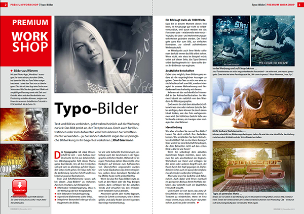 In unserem 10-Seiten-Feature zu Text & Typo geht es um die Techniken, mit denen man Vorlagen aller Art durch den Einsatz von Buchstaben aufwertet. Die Typografie kann dabei verschiedene Rollen einnehmen: Sie kann den Bildinhalt als optisch interessante Zusatzinformation ergänzen oder sie kann selbst als grafisches Gestaltungselement Hinter- beziehungsweise Vordergründe spannender gestalten.