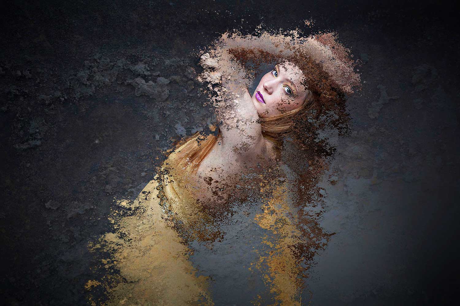 Durch Überlagern von Texturen mit geeigneten Füllmethoden können Sie Bilder älter erscheinen lassen oder, wie hier gezeigt, kreative Porträteffekte erzielen. Passen Sie die Texturen mit »Bearbeiten > Transformieren > Verformen« beziehungsweise »Filter > Verflüssigen« an die jeweilige Oberfläche an und blenden Sie die Texturen mit einer Maske selektiv aus.