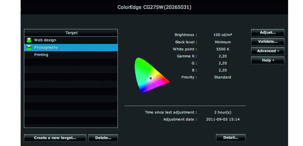 Der absolute Luxus des hier beschriebenen Eizo CG275W ist jedoch sein eingebautes Farbmessgerät. Dieses lässt sich – auf Wunsch auch automatisch – aktivieren und hält den Monitor ohne eigenes Zutun im Rahmen der eigenen Vorgaben farbverbindlich. Normalerweise muss man hierfür ein zusätzliches Messgerät anschaffen, wie den Spyder von Datacolor oder das i1 von Xrite, sich regelmäßig an die Kalibrierung erinnern lassen und diese dann unter Berücksichtigung von Monitorlaufzeit und Umgebungslichtparametern vornehmen. Hier geht das alles automatisch.