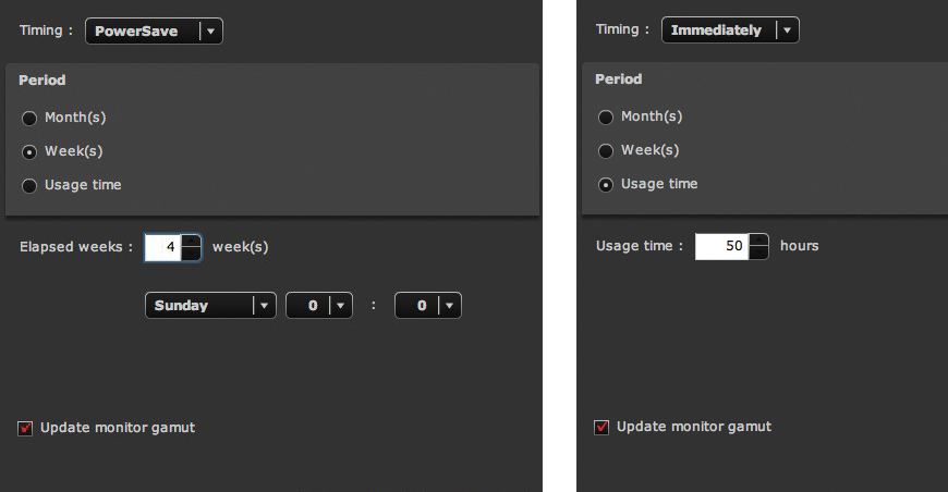 Um eine computerunabhängige vollautomatische Messung vorzunehmen, richten Sie unter der Schaltfläche „Advanced“ im Eintrag „SelfCalibration schedule“ eine Vorgabe vom Typ „PowerSave“ ein, in der Sie den Rhythmus festlegen. Normal sind vier Wochen als Zeitraum. Sie können den Messabstand aber auch für nicht täglich genutzte Systeme anhand von Arbeitsstunden bestimmen.
