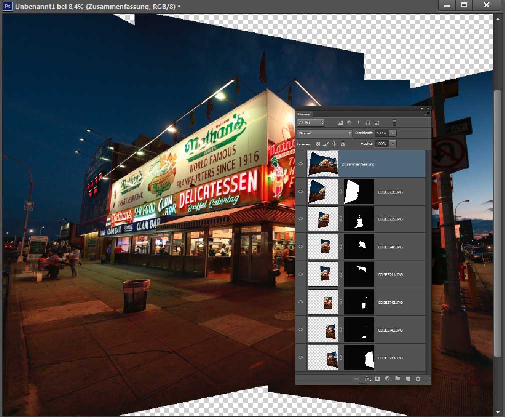 Das Hochformat maximiert den vertikalen Bildwinkel, während die Kombination mehrerer Bilder für den vergrößerten horizontalen Bildwinkel sorgt. Das anschließende Stitching der Einzelbilder gelingt mit Photoshop auch bei handgehaltenen Aufnahmen mittlerweile einfach, schnell und robust.