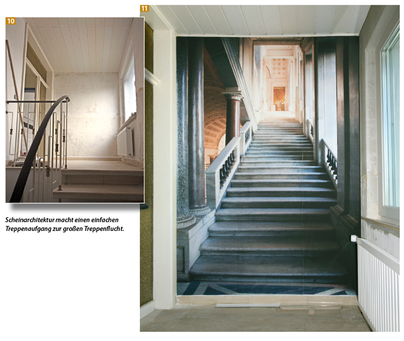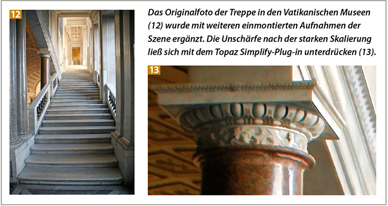 Das Problem dabei ist, dass Scheinarchitektur nur dann stimmig wirkt, wenn die Perspektive und damit der Betrachterstandort stimmen. In einem Treppenhaus ist dieser Standort emporsteigender Besucher kalkulierbar. So lag es nahe, die Wand gegenüber dem Treppenabsatz [10] mit dem Bild einer weiteren Treppe zu ergänzen. Dafür wählte ich einen Aufgang aus den Vatikanischen Museen [12], den ich im Laufe der Jahre mehrfach fotografiert hatte, so dass mir nach der Anpassung an die Proportionen der Wand ausreichend Montagematerial zur Verfügung stand. Da sich auch hier das Problem ergab, dass die Auflösung der Digitalfotos für eine Fläche von mehreren Quadratmetern nicht ausreichte, setze ich wiederum einen Filter für Strukturierung und Schärfung ein, in diesem Fall Simplify von Topaz [13].