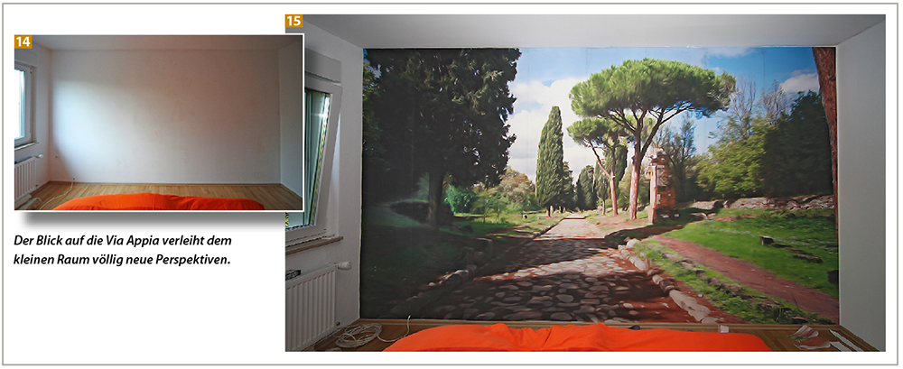 Ein 12-Quadratmeter-Schlafzimmer ist nicht groß [14]. Aber es lässt sich mit einem geeigneten Bild zumindest optisch um ein paar tausend Quadratmeter erweitern. Die Via Appia Antica vor Rom erschien mir da passend – ein erfreulicher Ausblick nach dem Aufwachen [15]. Bald hatte ich ein Motiv in meinem Archiv gefunden [16, Ausschnitt], leider mit etlichen Mängeln wie den Lkw-Reifenspuren rechts oder Markierungen und Maschendrahtzaun links.